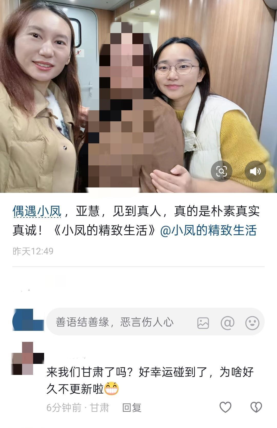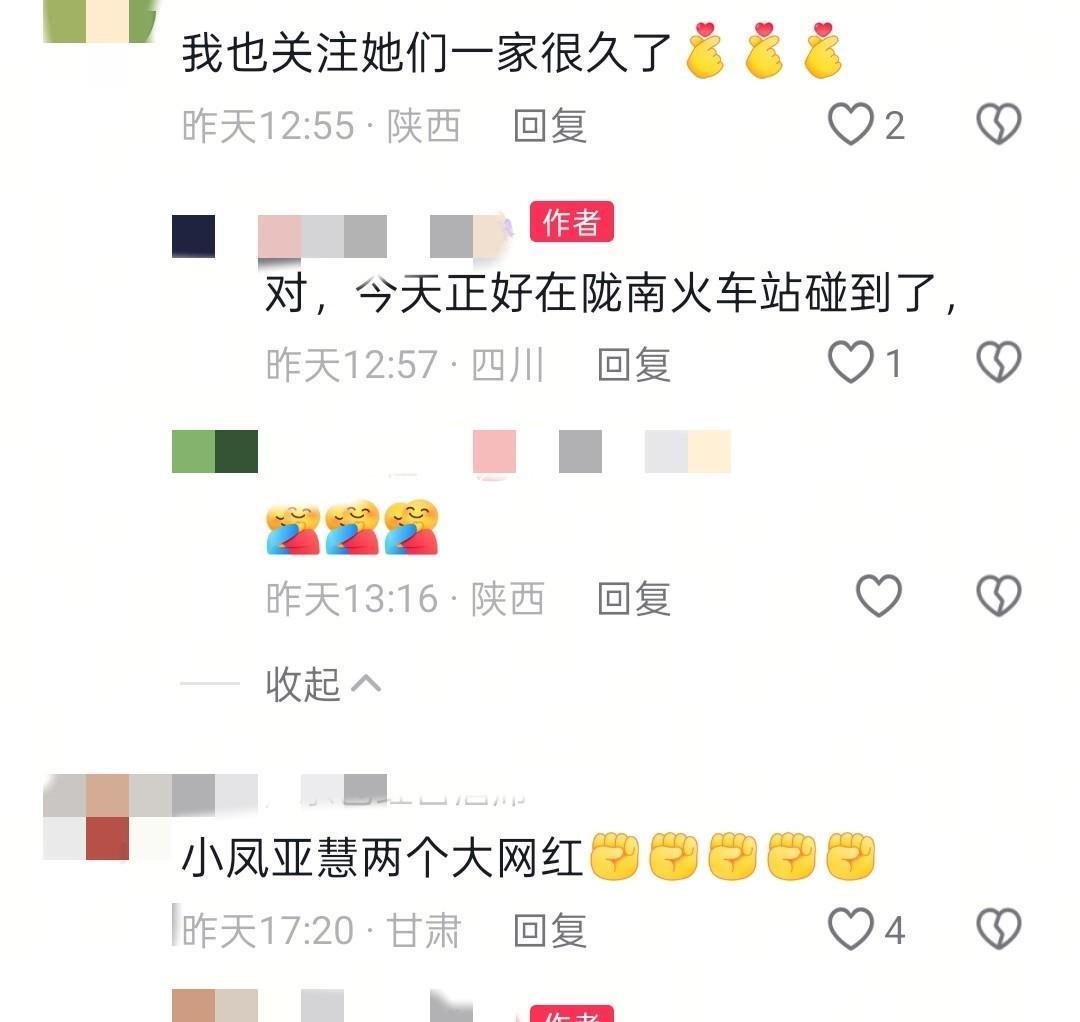 网友表示,偶遇小凤,是纯属巧合,遇见的地点是陇南火车站,小凤跟亚慧在一起,小凤看起来状态不错,笑得很开心,跟粉丝的互动朴素且真诚。