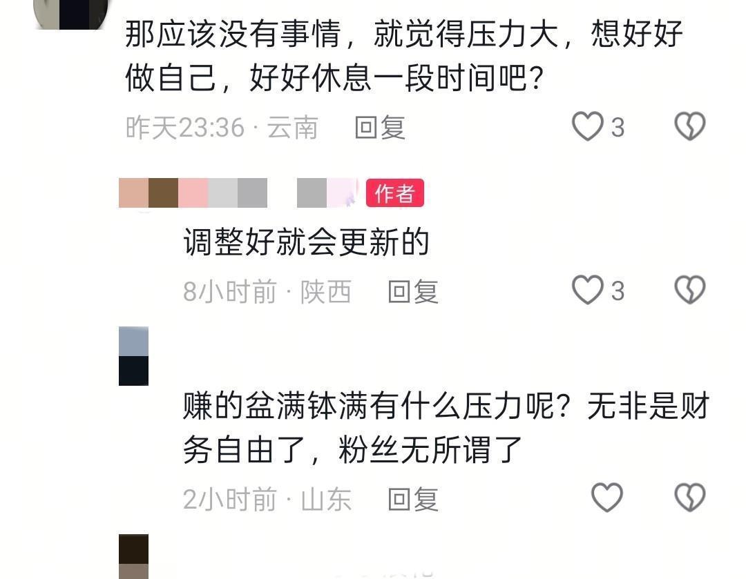 不过,粉丝表示,跟小凤聊完,知道小凤确实是有事,所以才会断更,之后调整好,还是会正常更新的。